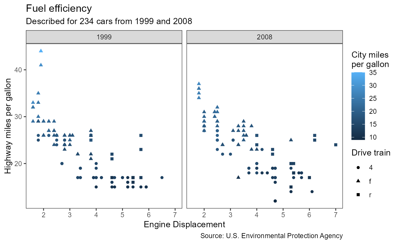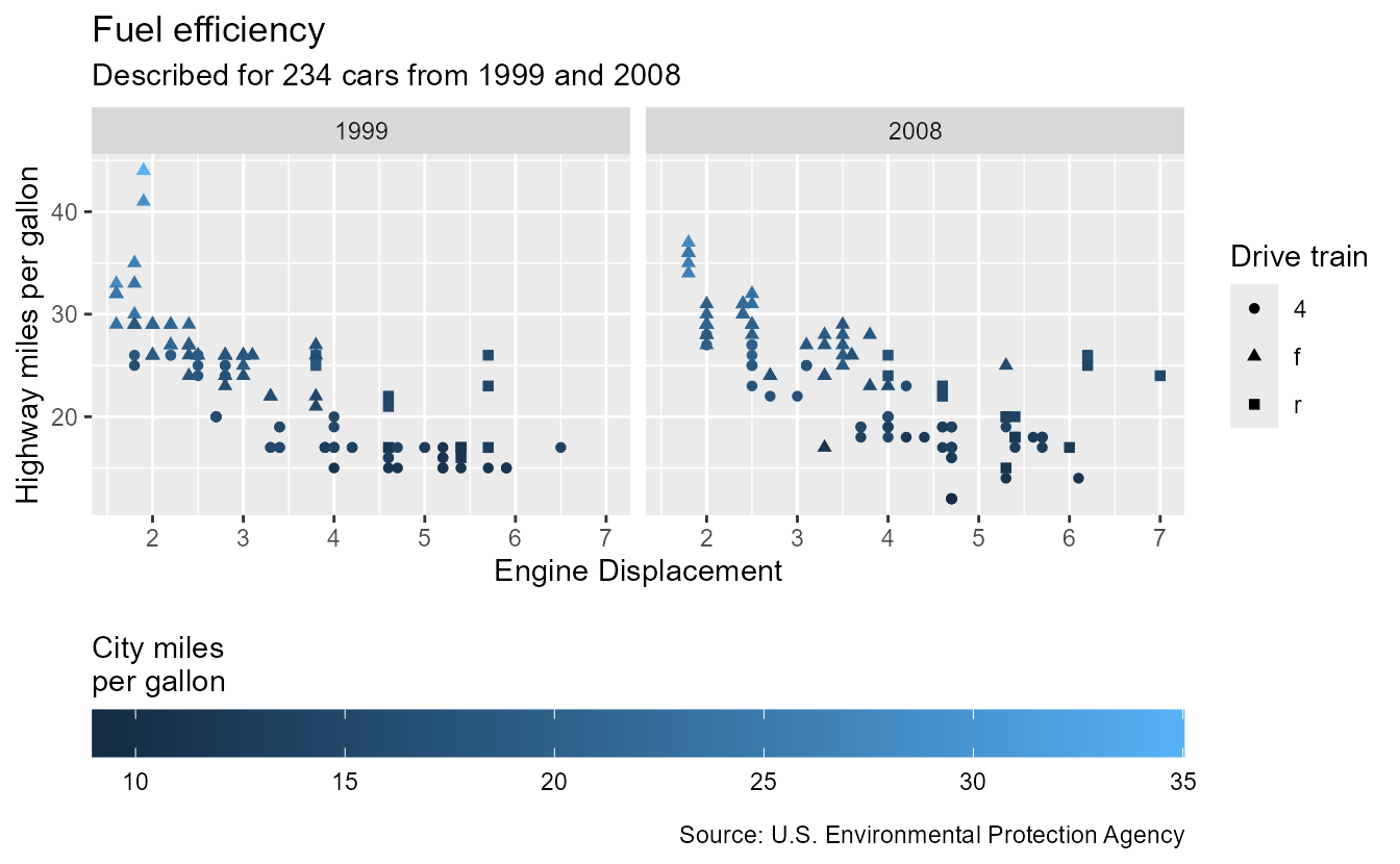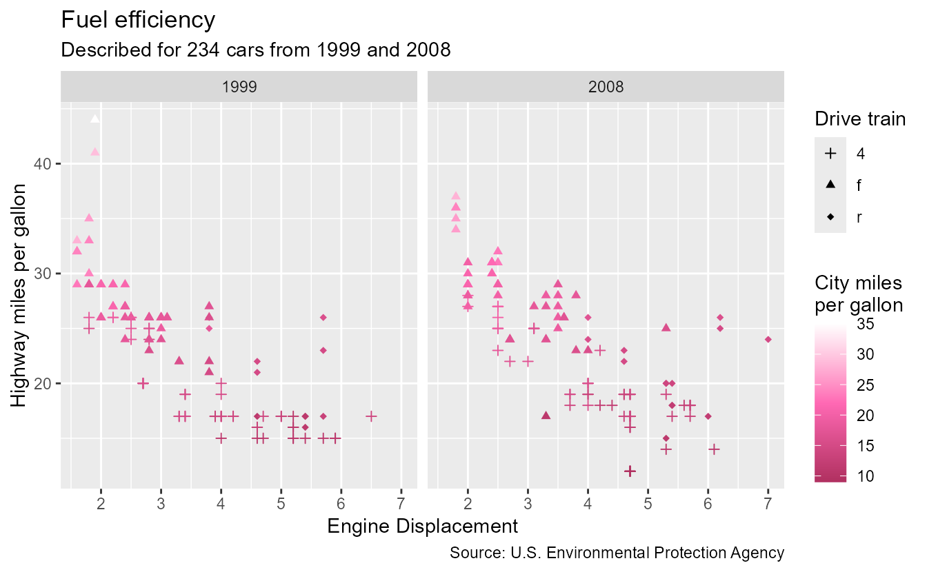 p <- ggplot(mpg, aes(displ, hwy, colour = cty, shape = drv)) +