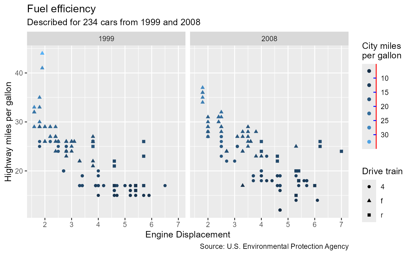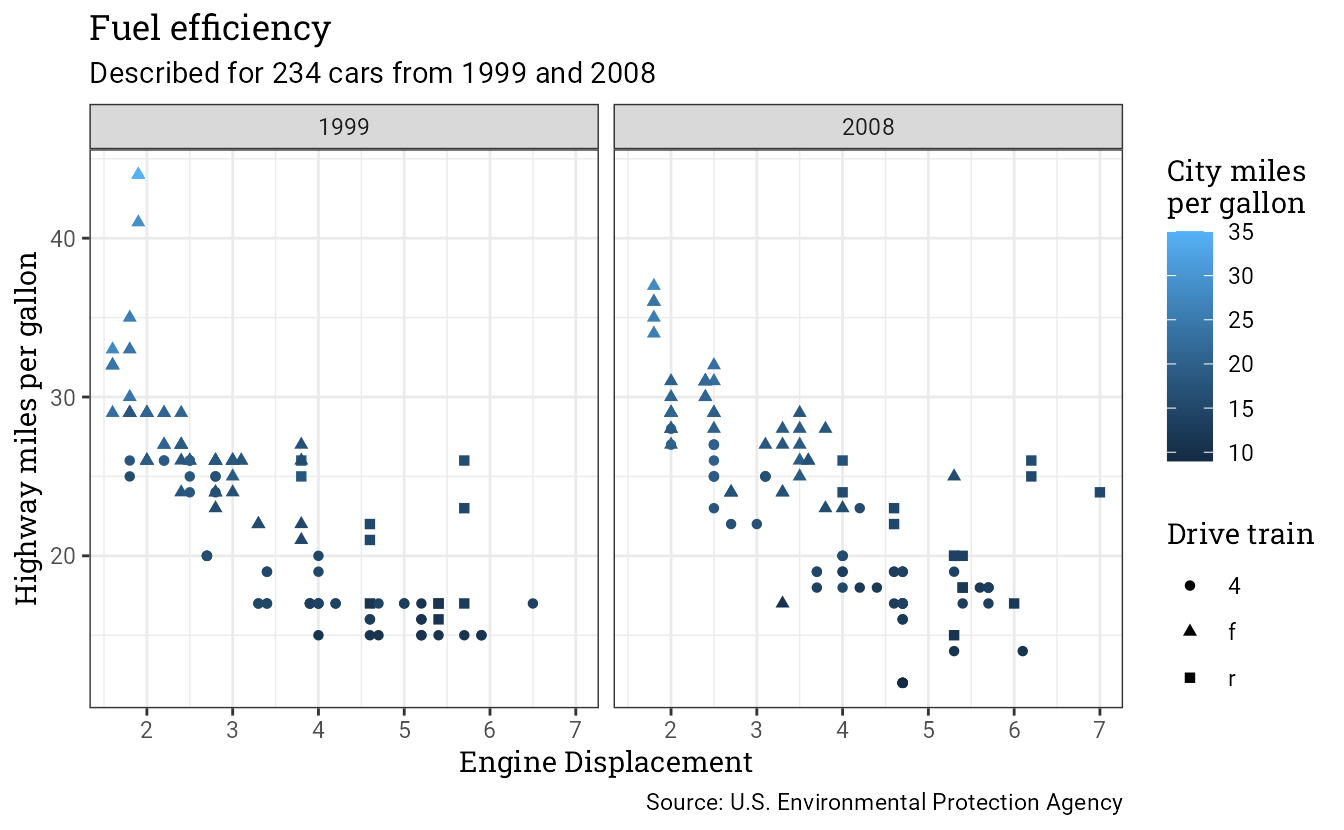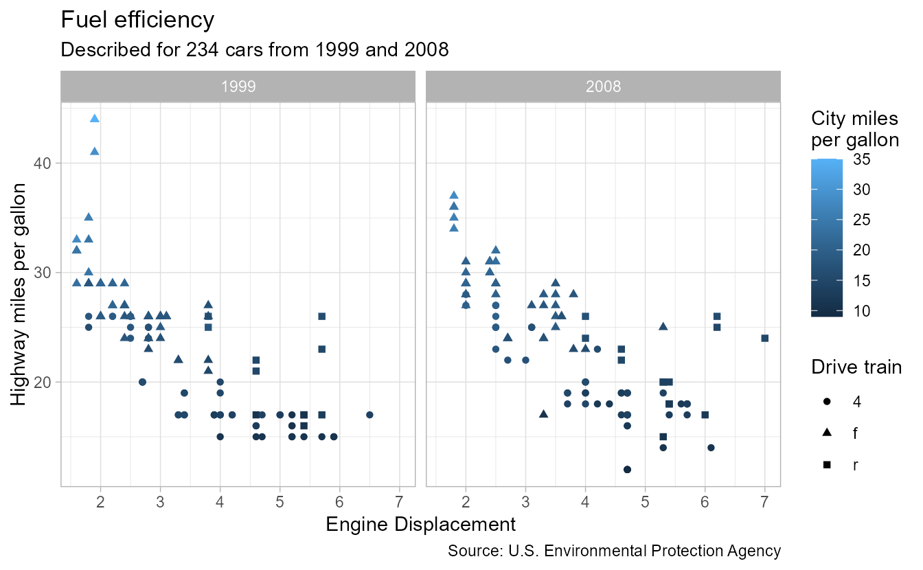p <- ggplot(mpg, aes(displ, hwy, colour = cty, shape = drv)) +
