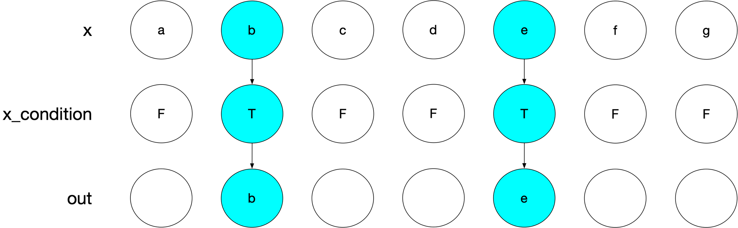 Instead, you must pre-slice x to a length that matches the locations that x_condition points to in out, i.e.: